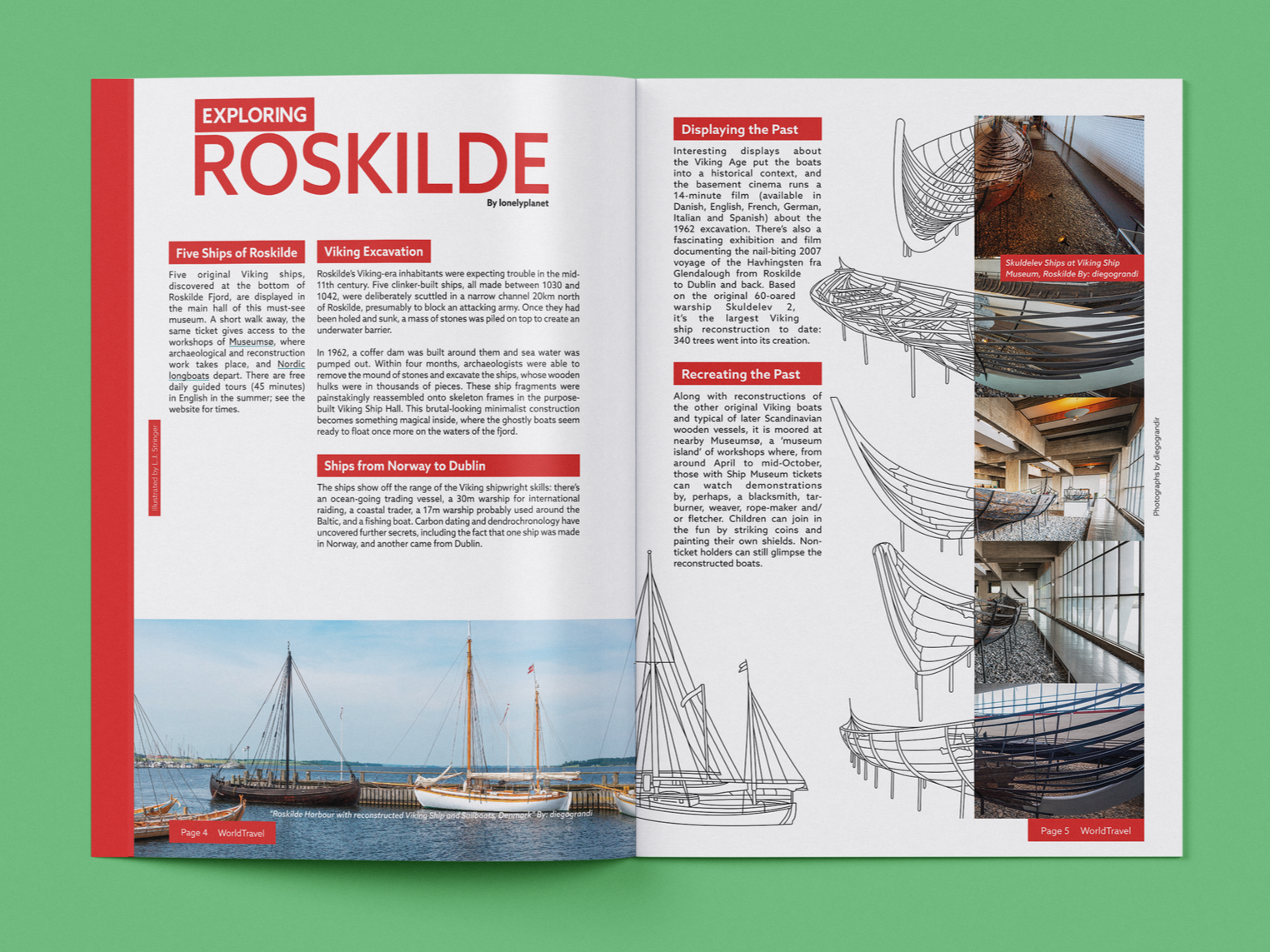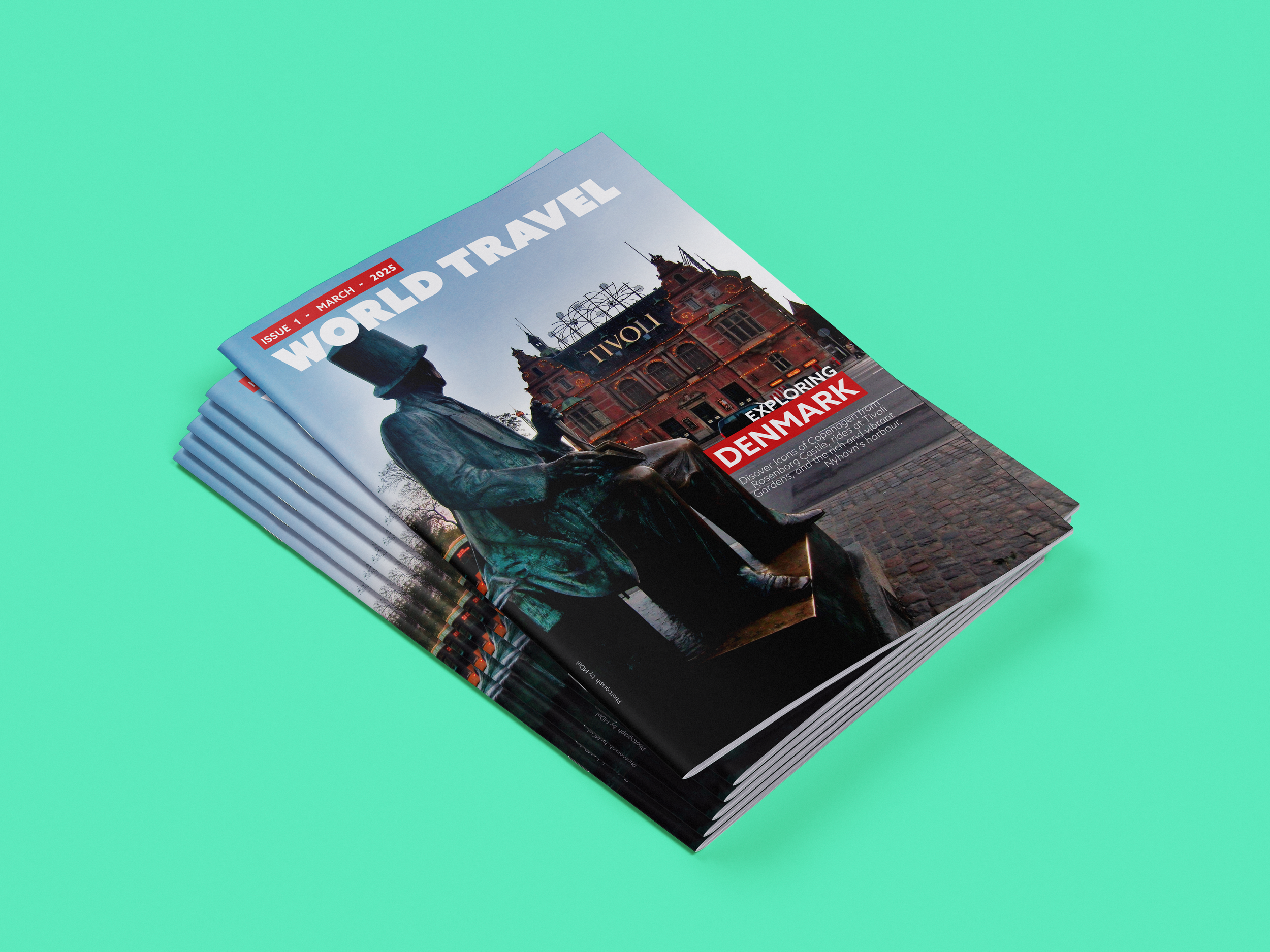 A coloured magazine poster featuring a medium of at least three images across the cover and two spread magazine layouts showcasing key destinations of Denmark.